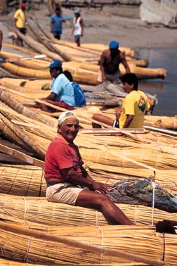 A veteran Huanchaco fisherman waits for the right moment to set out for a day's fishing.